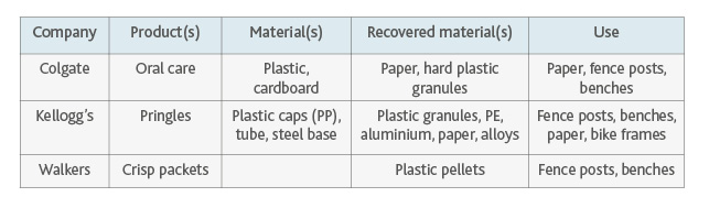 The cardboard toothpaste cartons are used to make new paper. Plastic is shredded, washed and sorted. The material is then dried, compounded and pelletized into hard-granulated plastic granules. The granules are then incorporated into the production of different plastic products such as fence posts and benches.